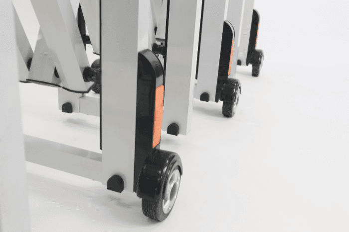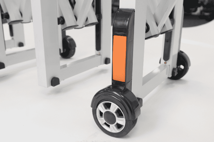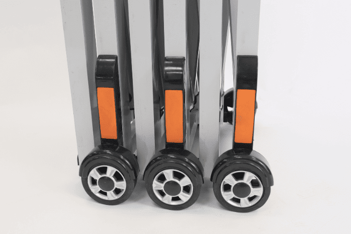 This retractable safety barrier is easy to manoeuvre by one person and rolls smoothly on six wheels. Bright orange strips and coated grips enhance visibility and handling, helping to reduce trip hazards. The interlocking system with built-in lock allows multiple units to be securely connected, and it extends up to 2.1 m. Durable aluminium construction with a sleek silver and black finish makes it ideal for indoor or outdoor commercial use.