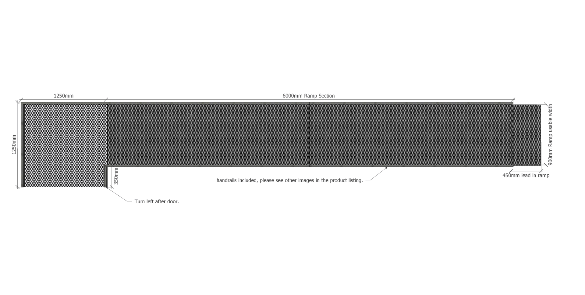 Modular Ramp Kit, 6000mm long, 900mm wide, with double height handrails and mesh anti-slip surface.