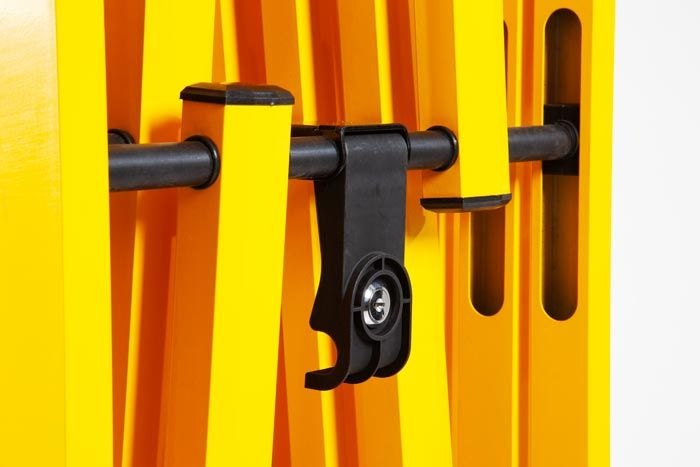 Its interlocking design allows multiple barriers to be connected to achieve the desired length, while the bright yellow finish ensures excellent visibility in any setting. The compact structure also allows for convenient storage when not in use.