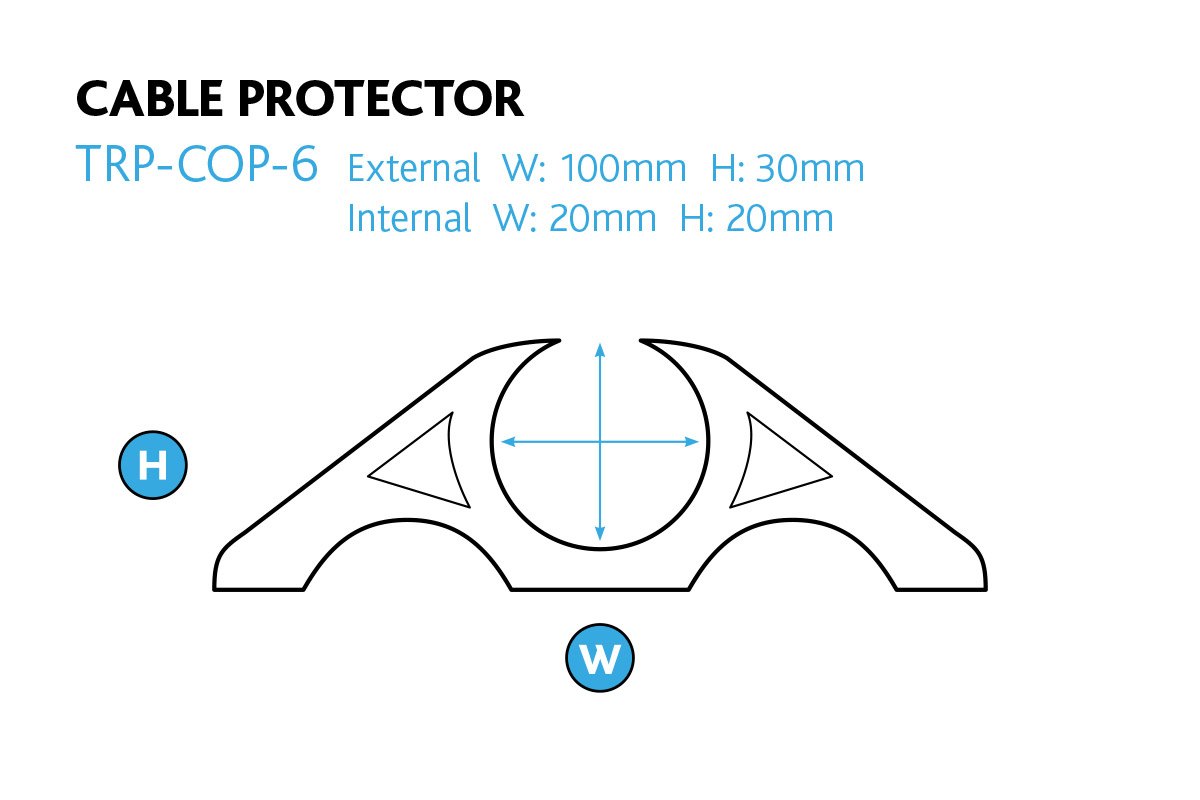 Molded from 80% virgin PVC and 20% NBR, The Ramp Factory's cable protector is designed to allow for easy installation and removal of cables. Designed in a triangular shape, it can accommodate cables with a diameter of 20 mm in the top hole, and 8 mm in the two lower holes.