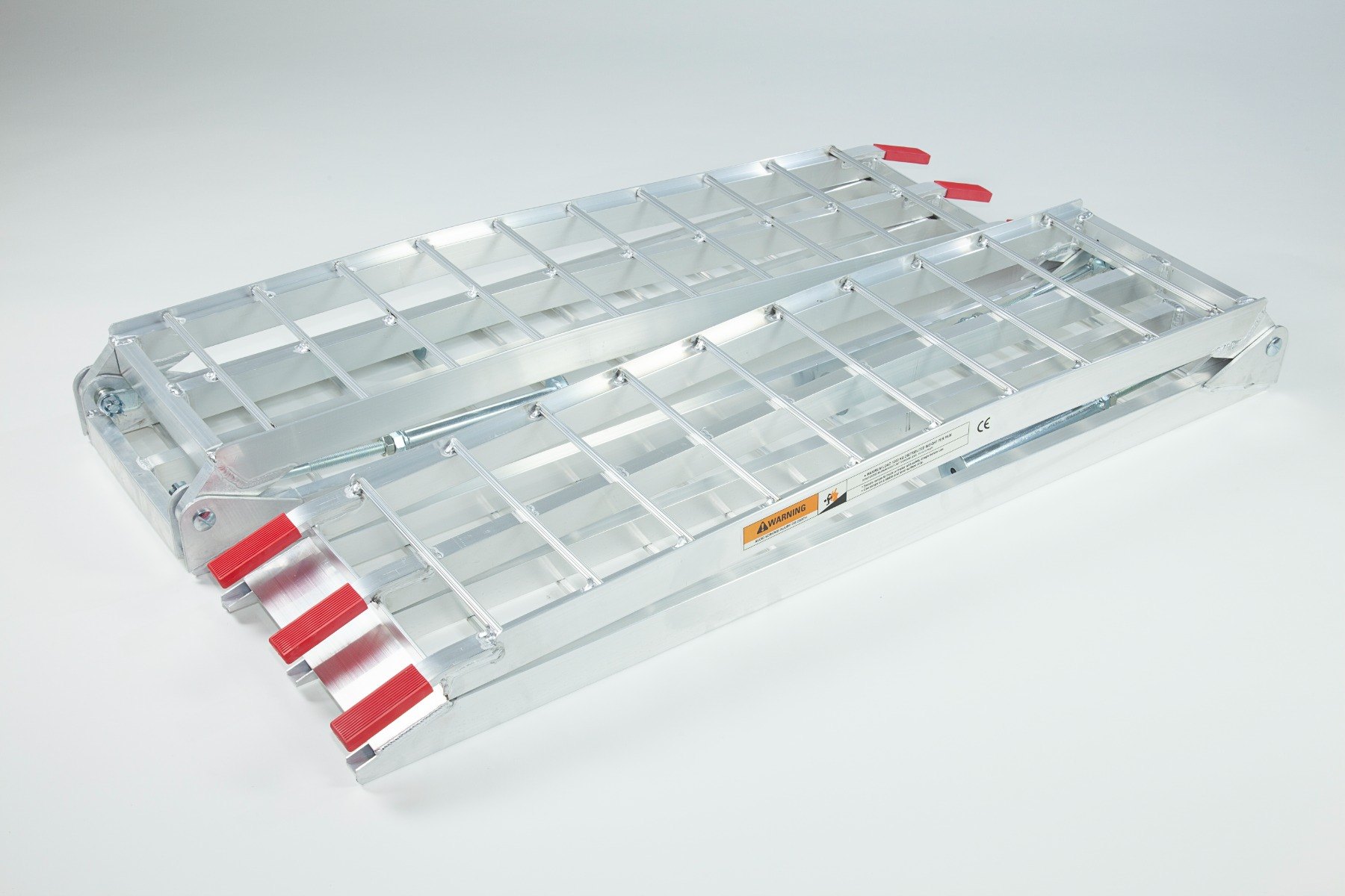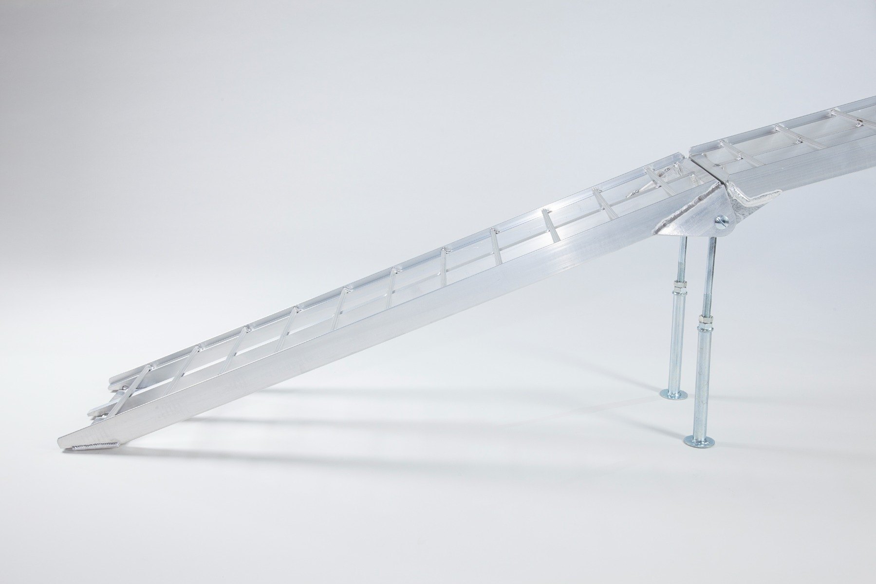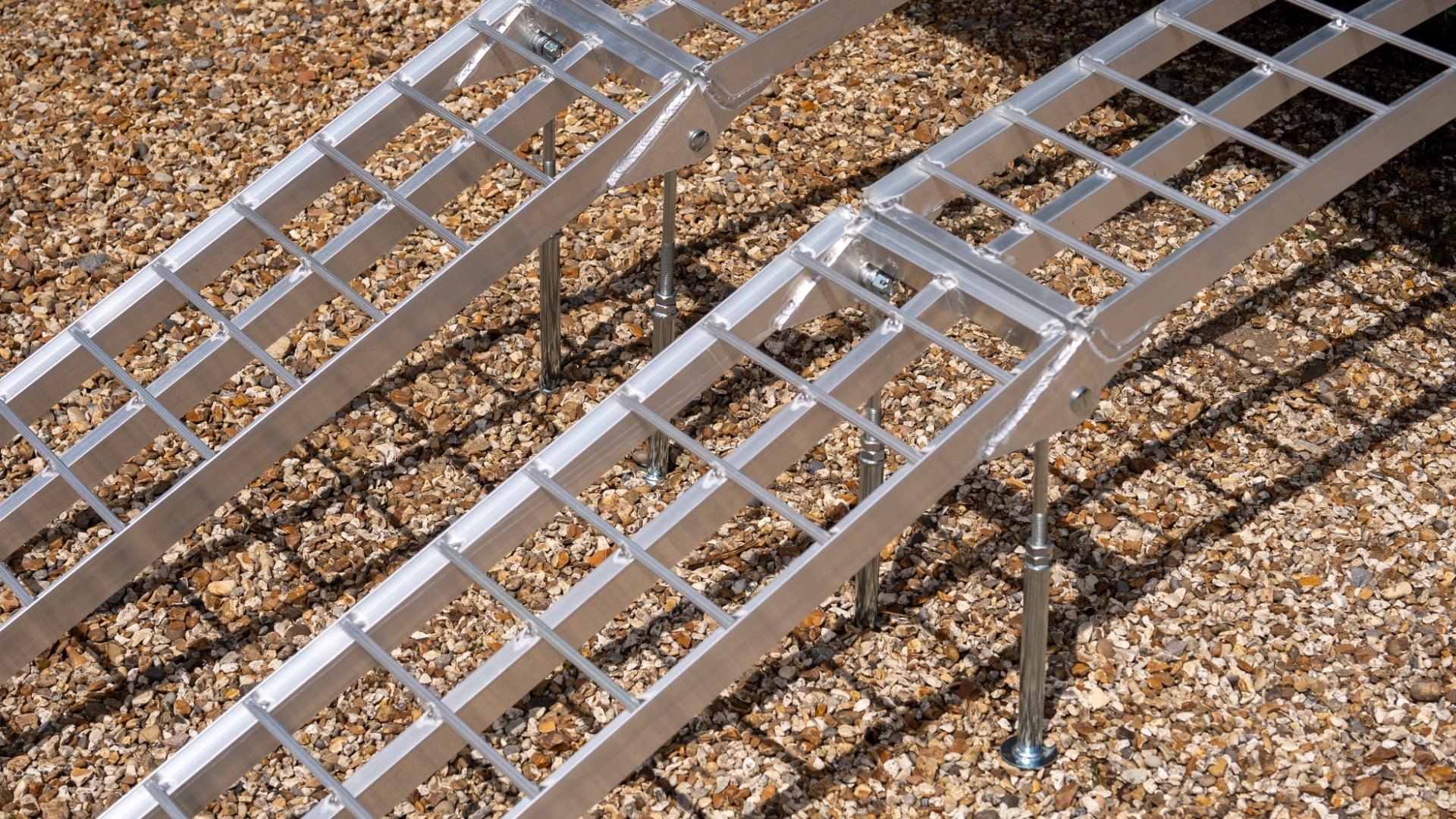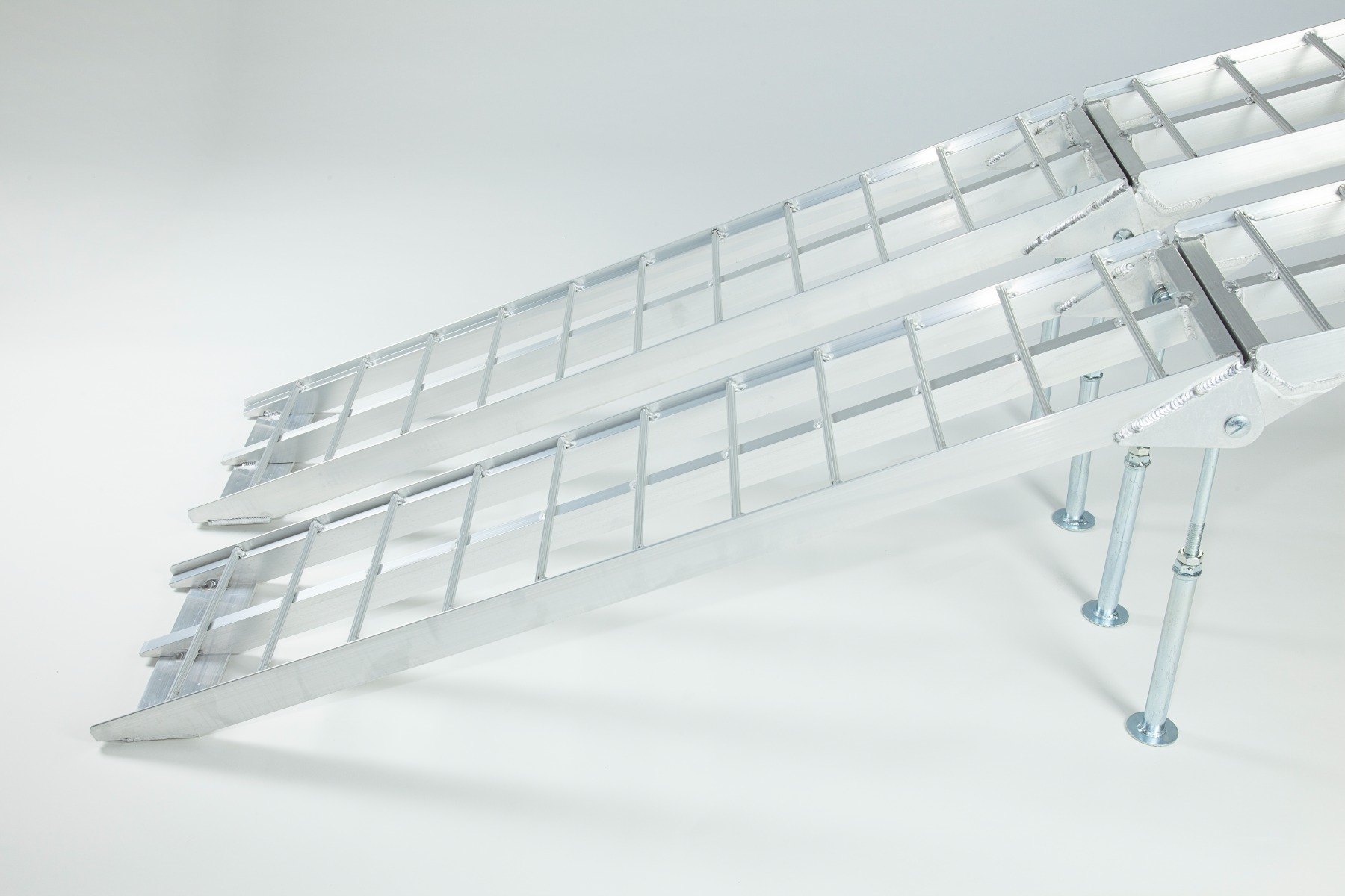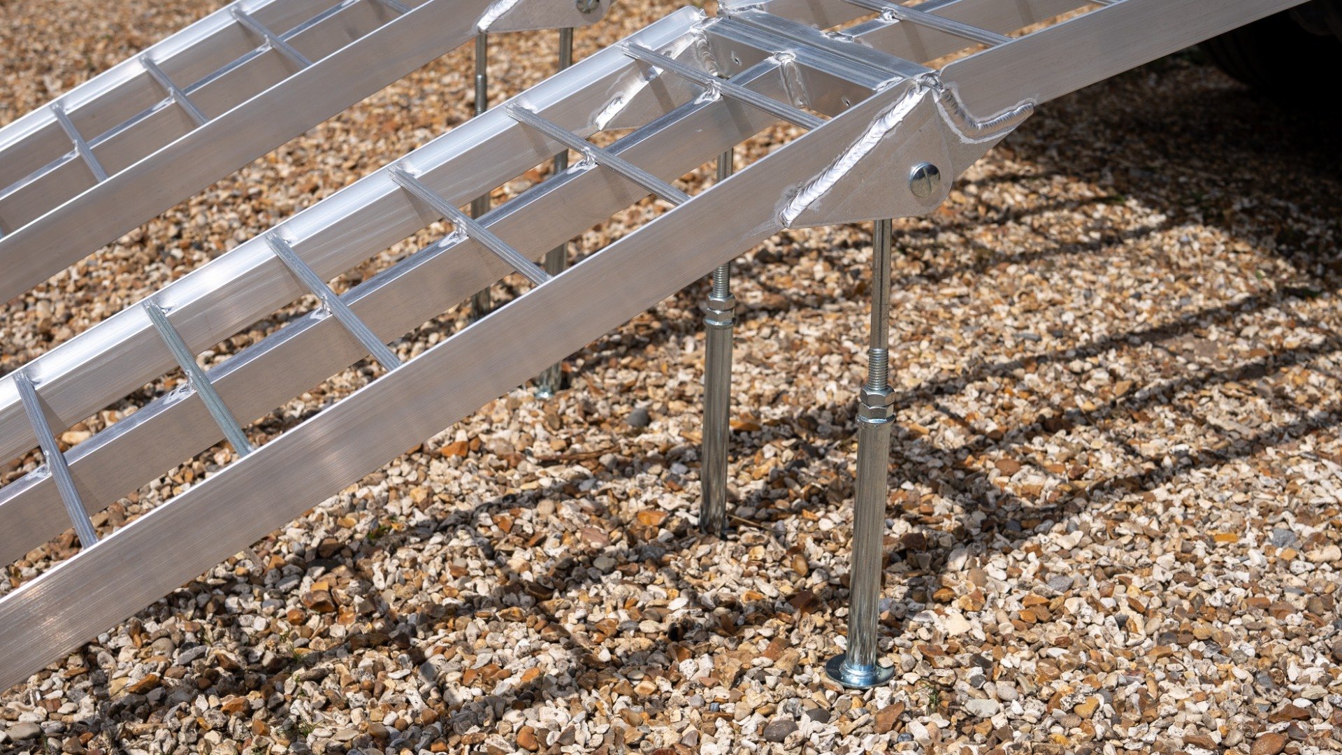The Ramp Factory's lightweight aluminium folding loading ramps with double support bar are slightly curved for improved ground clearance. Each ramp has a capacity of 680kg (1360kg across the pair). The support bar legs can be adjusted from 340mm up to 425mm.