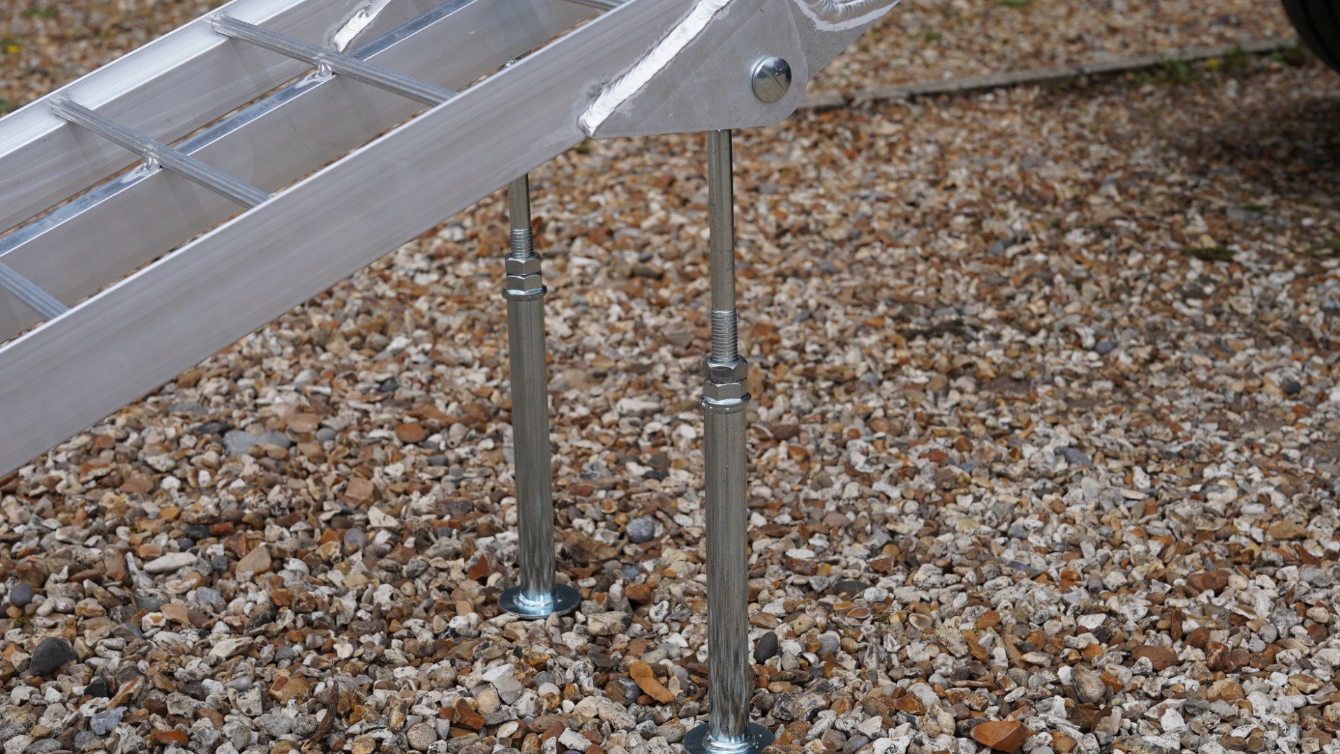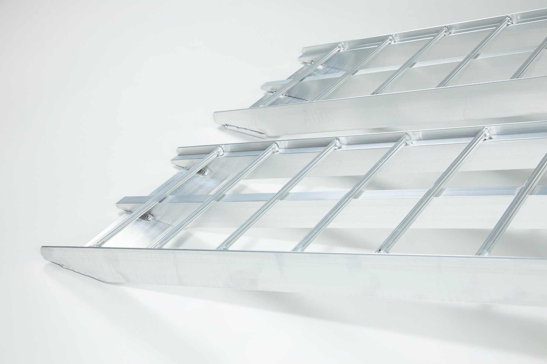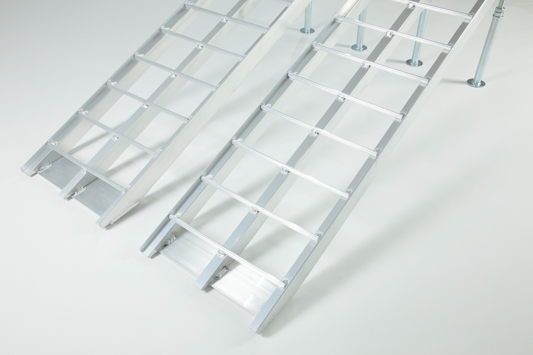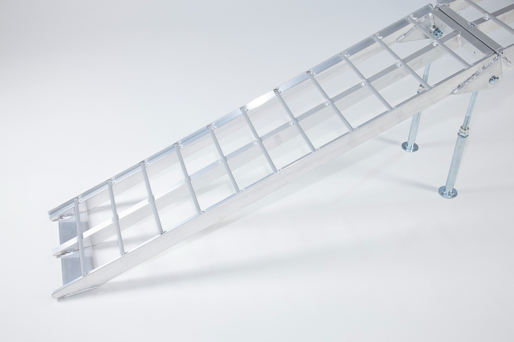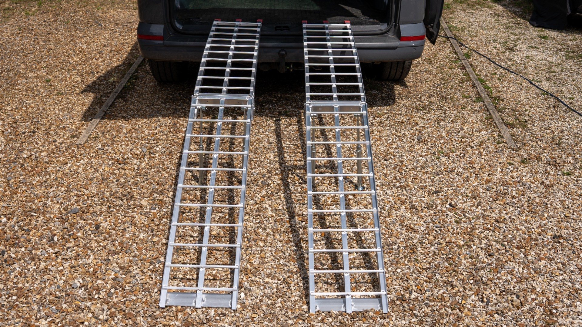 The Ramp Factory's lightweight aluminium folding loading ramps with double support bar are slightly curved for improved ground clearance. Each ramp has a capacity of 680kg (1360kg across the pair). The support bar legs can be adjusted from 340mm up to 425mm.