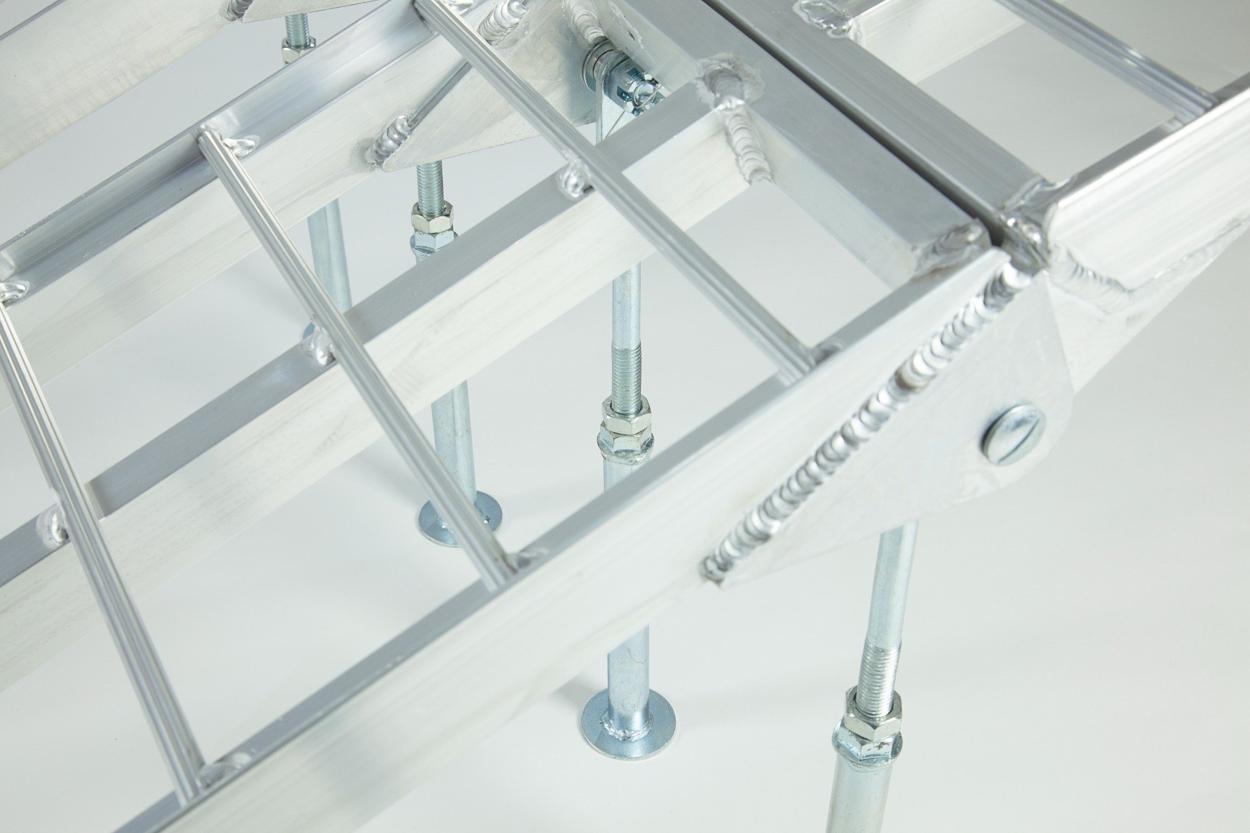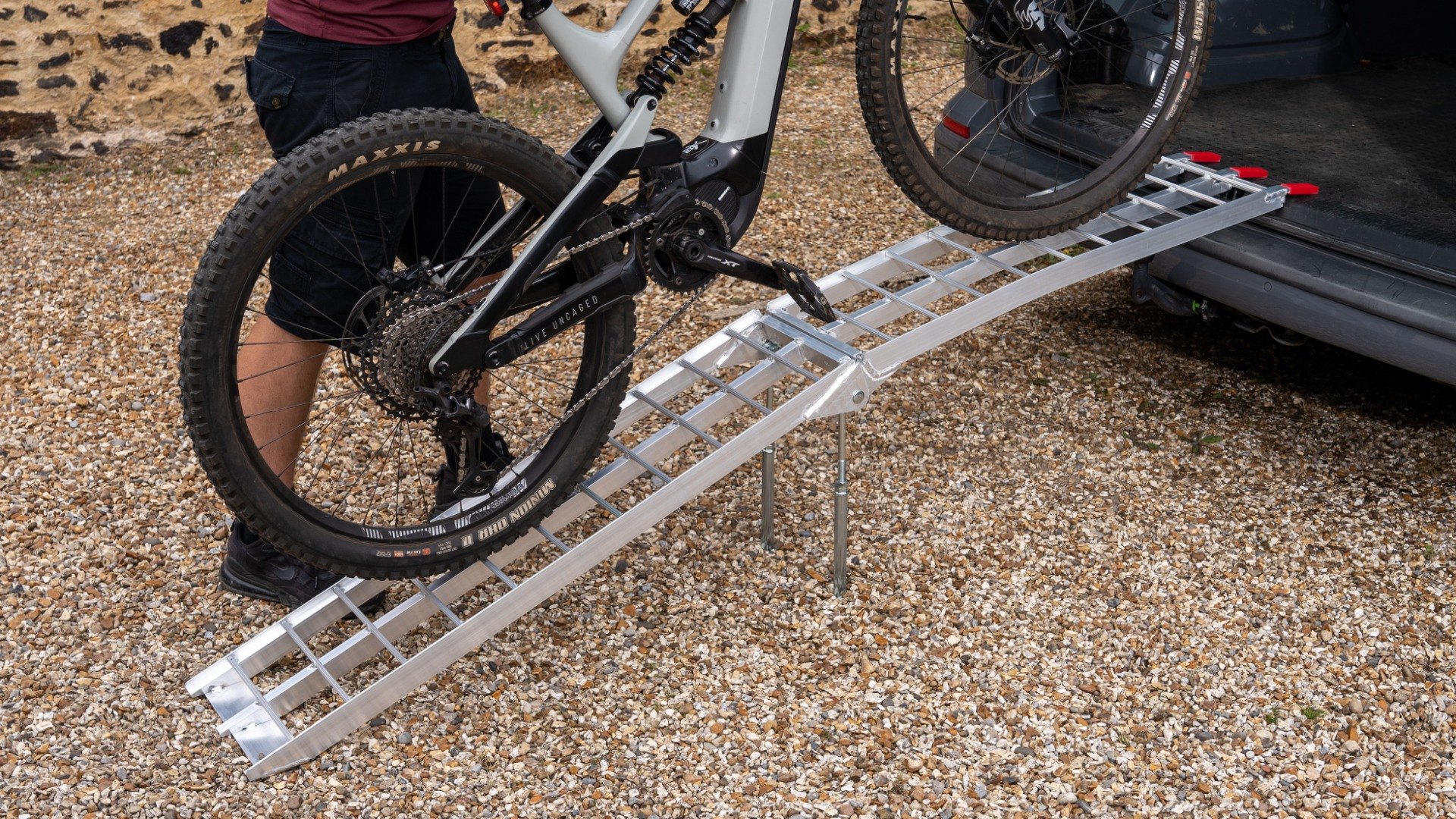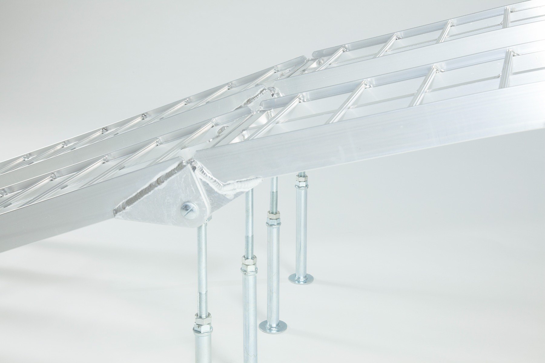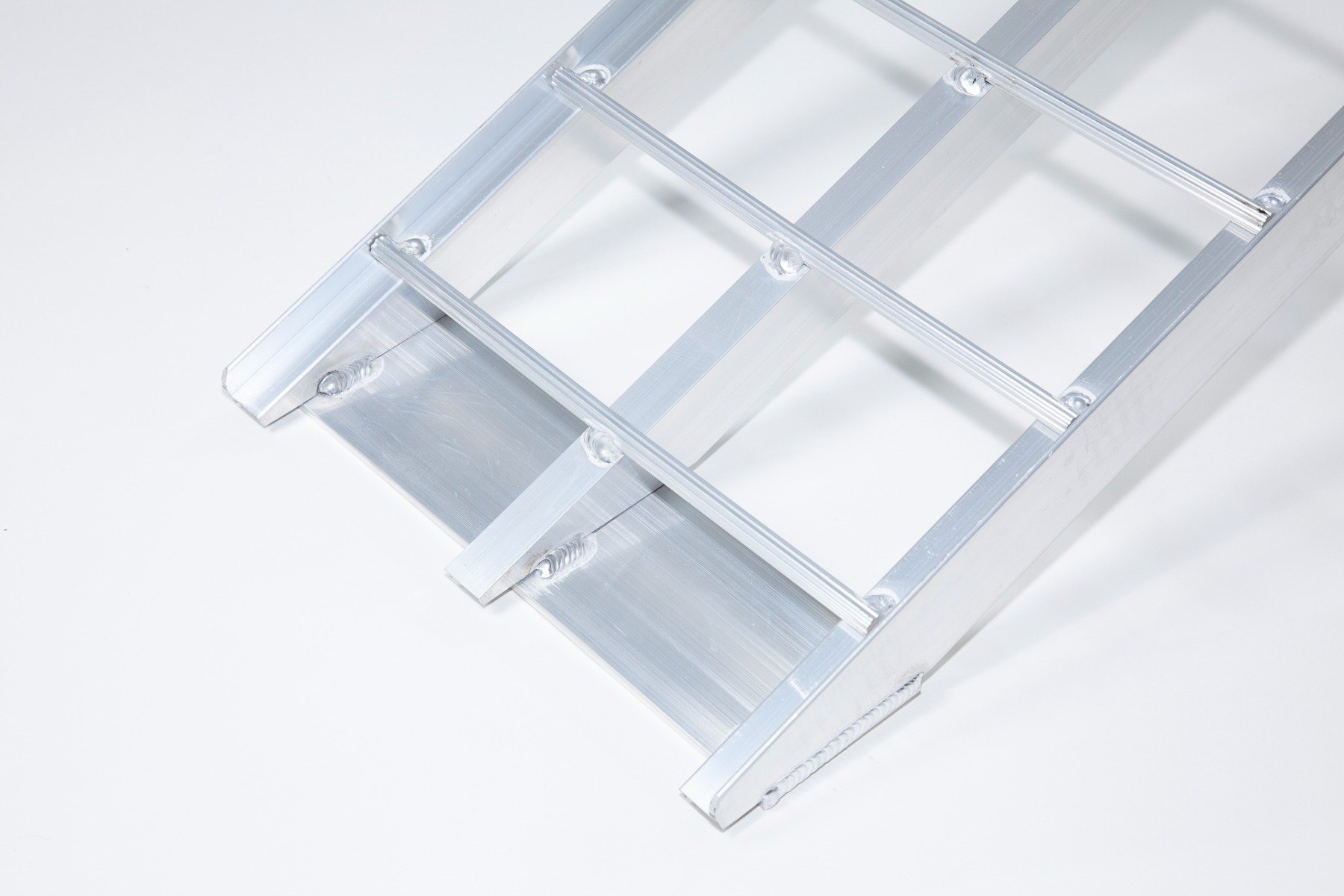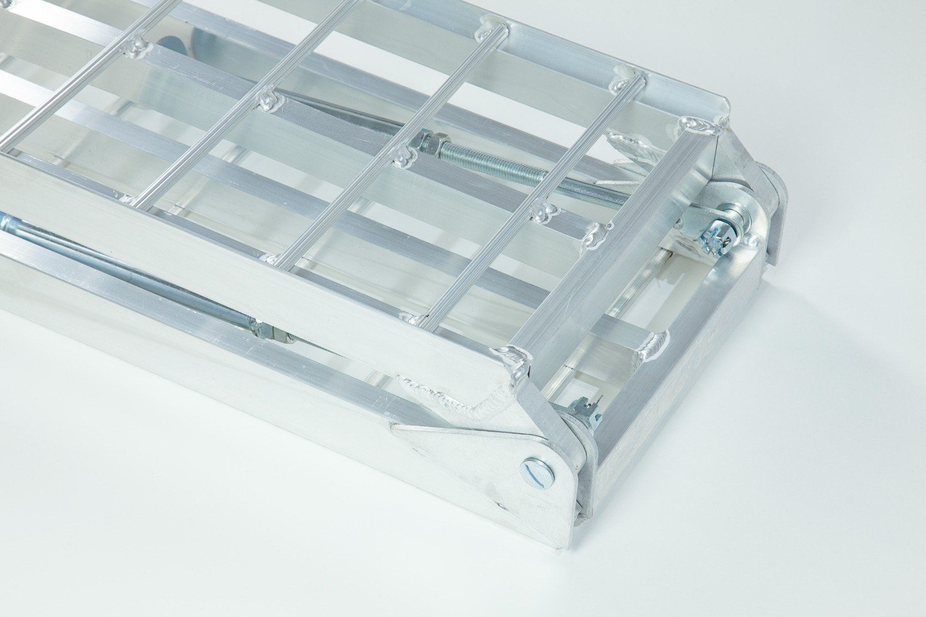 The Ramp Factory's lightweight aluminium folding loading ramps with double support bar are slightly curved for improved ground clearance. Each ramp has a capacity of 680kg (1360kg across the pair). The support bar legs can be adjusted from 340mm up to 425mm.