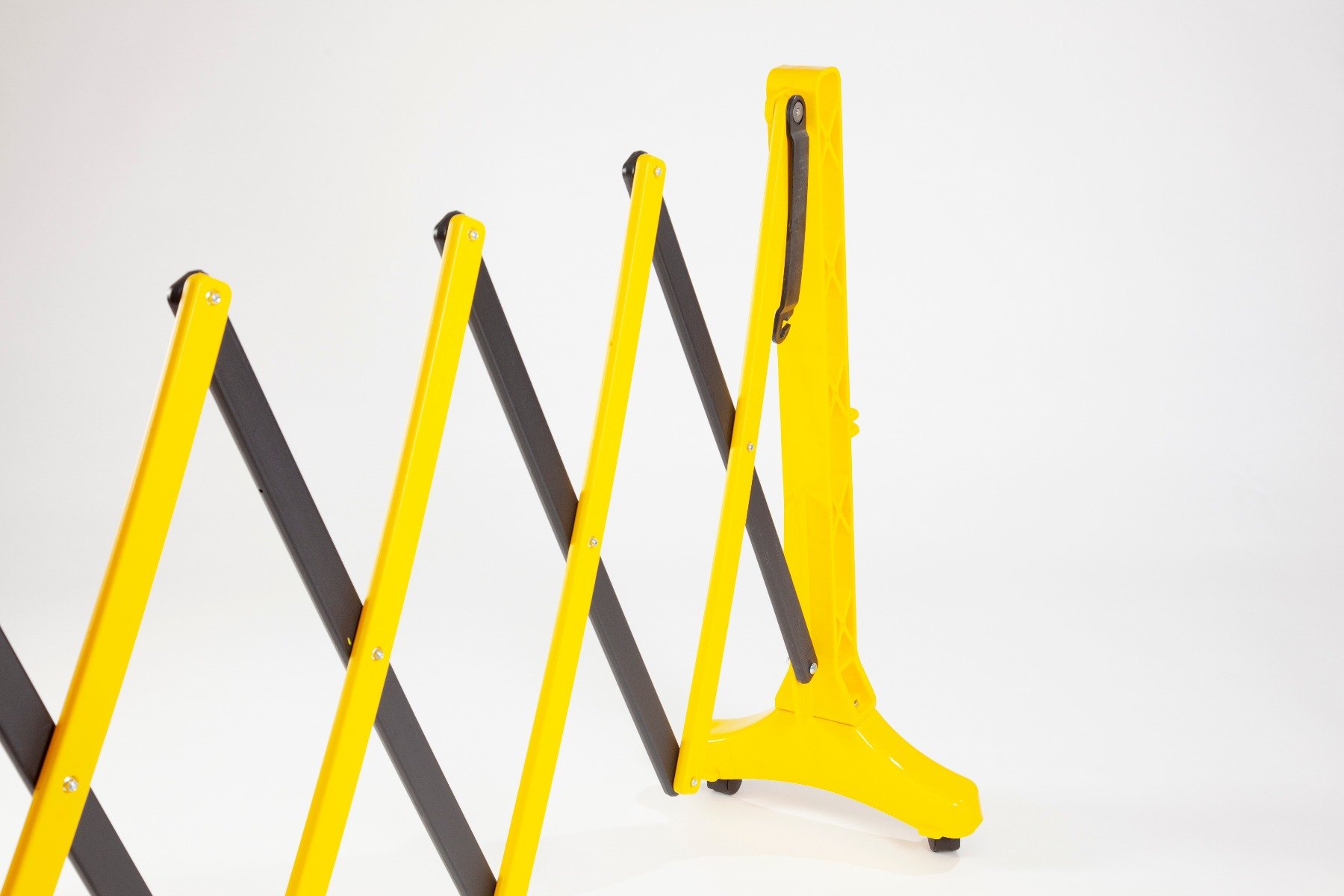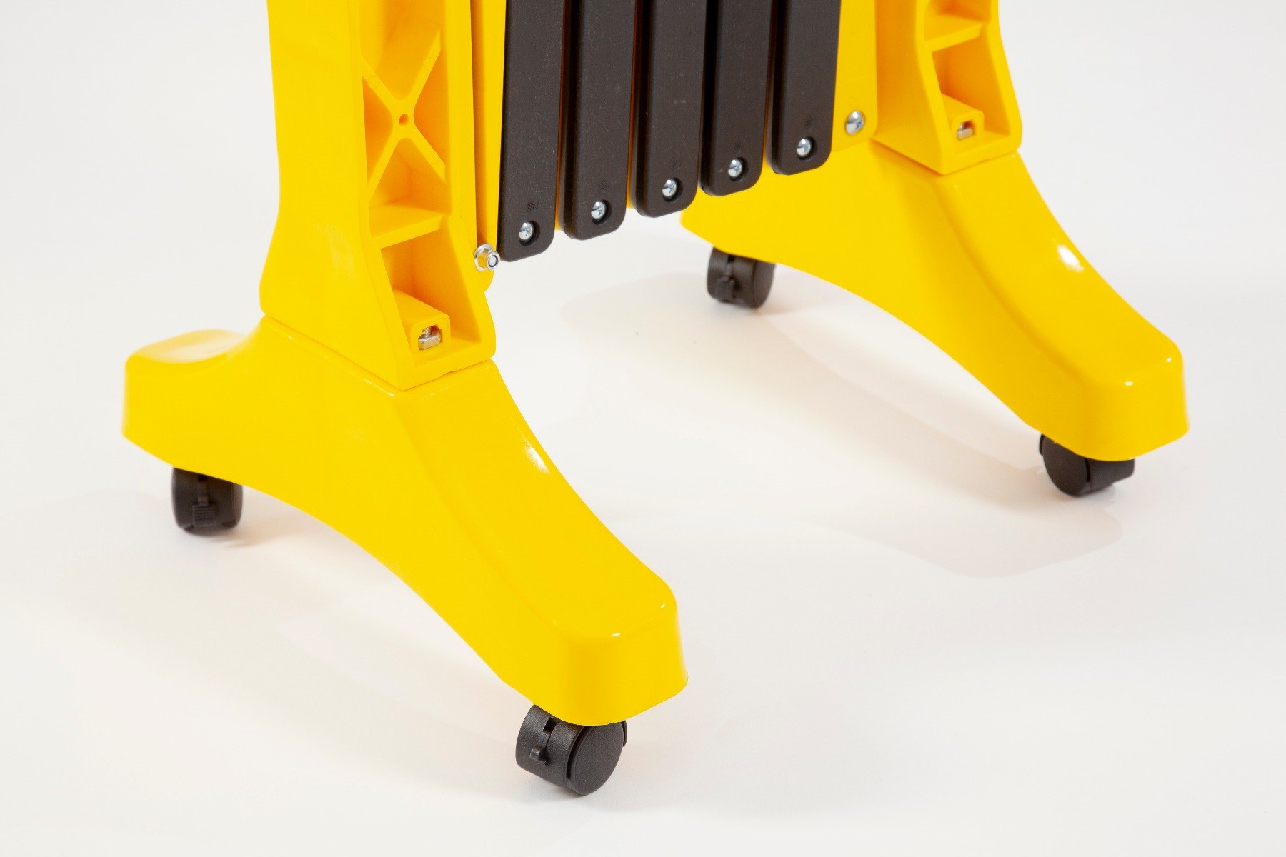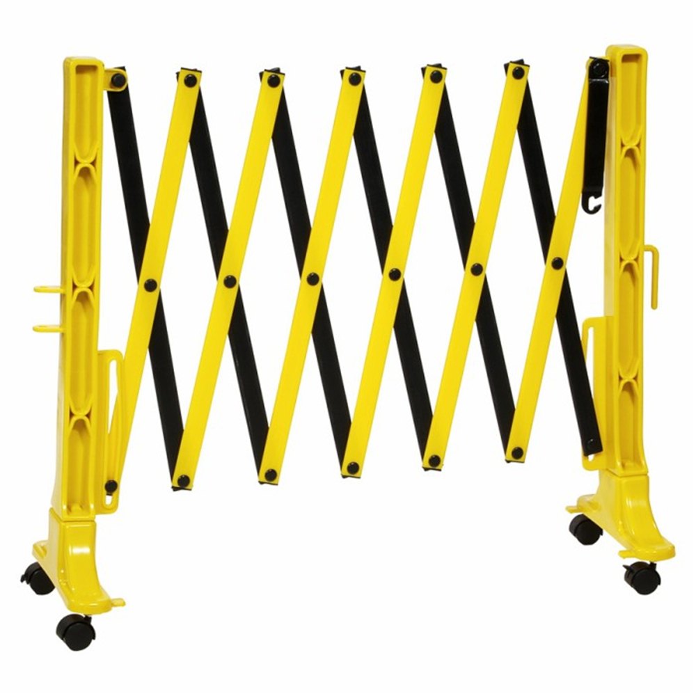 Expandable barrier with wheels for easy handling, manufactured from durable, corrosion-resistant HDPE plastic in a high-vis black and yellow finish.