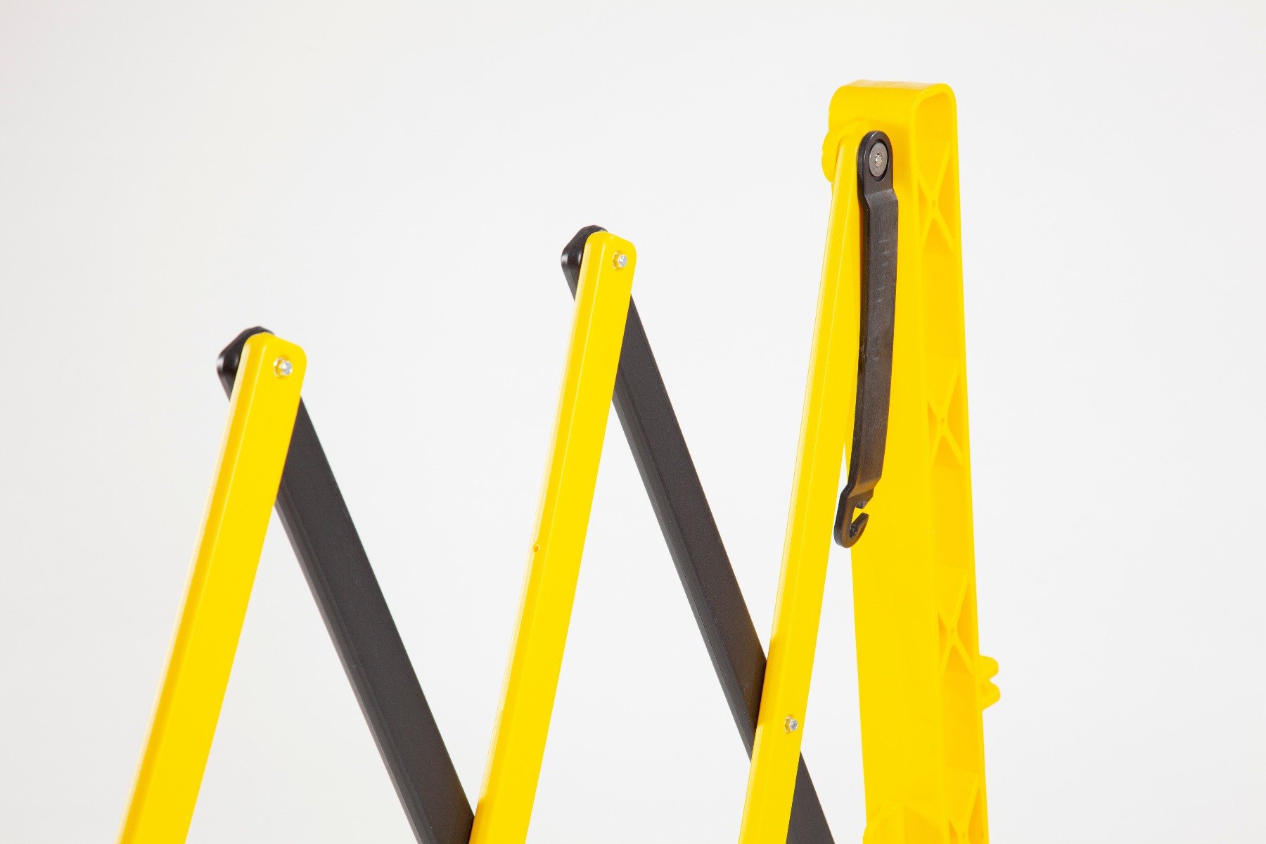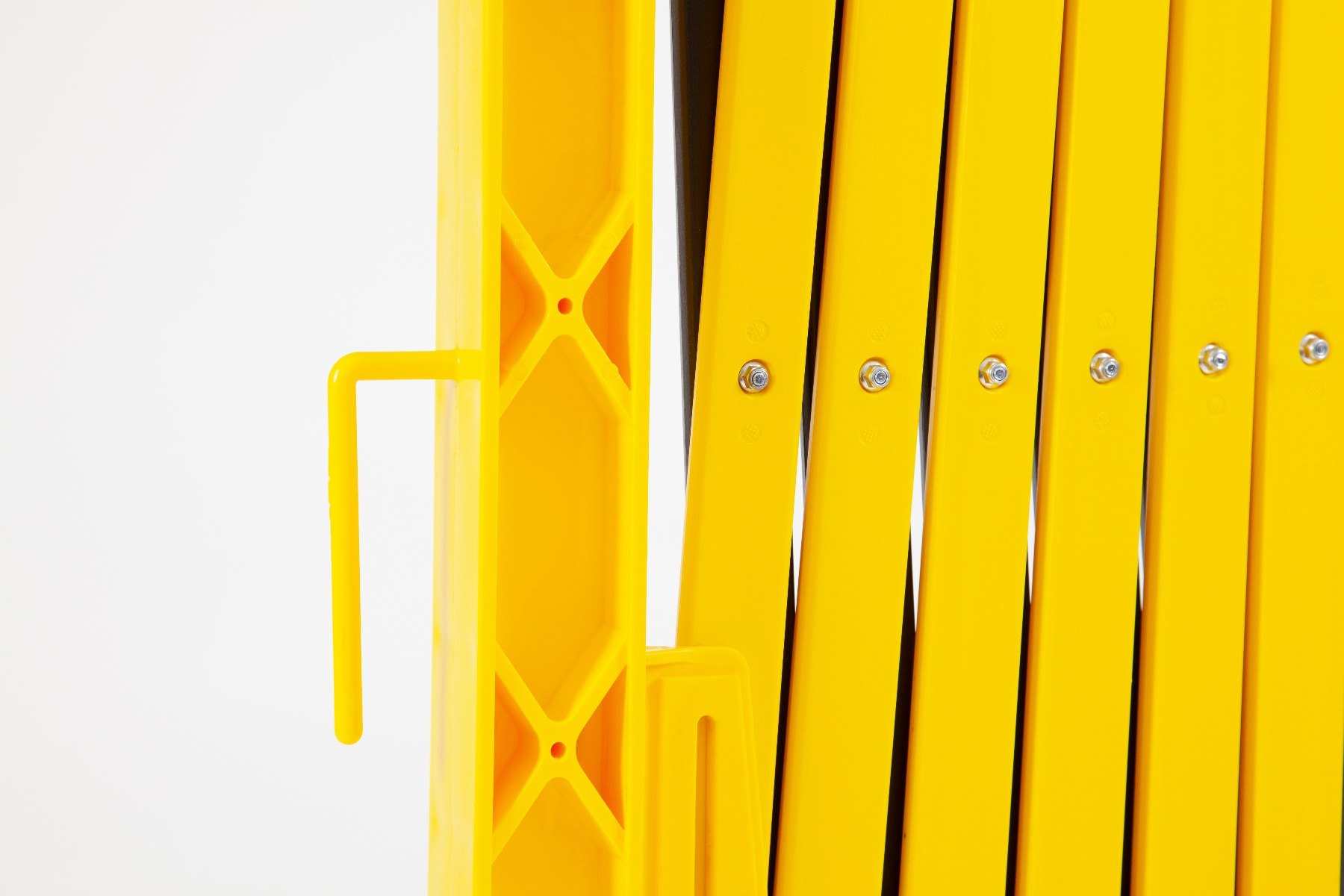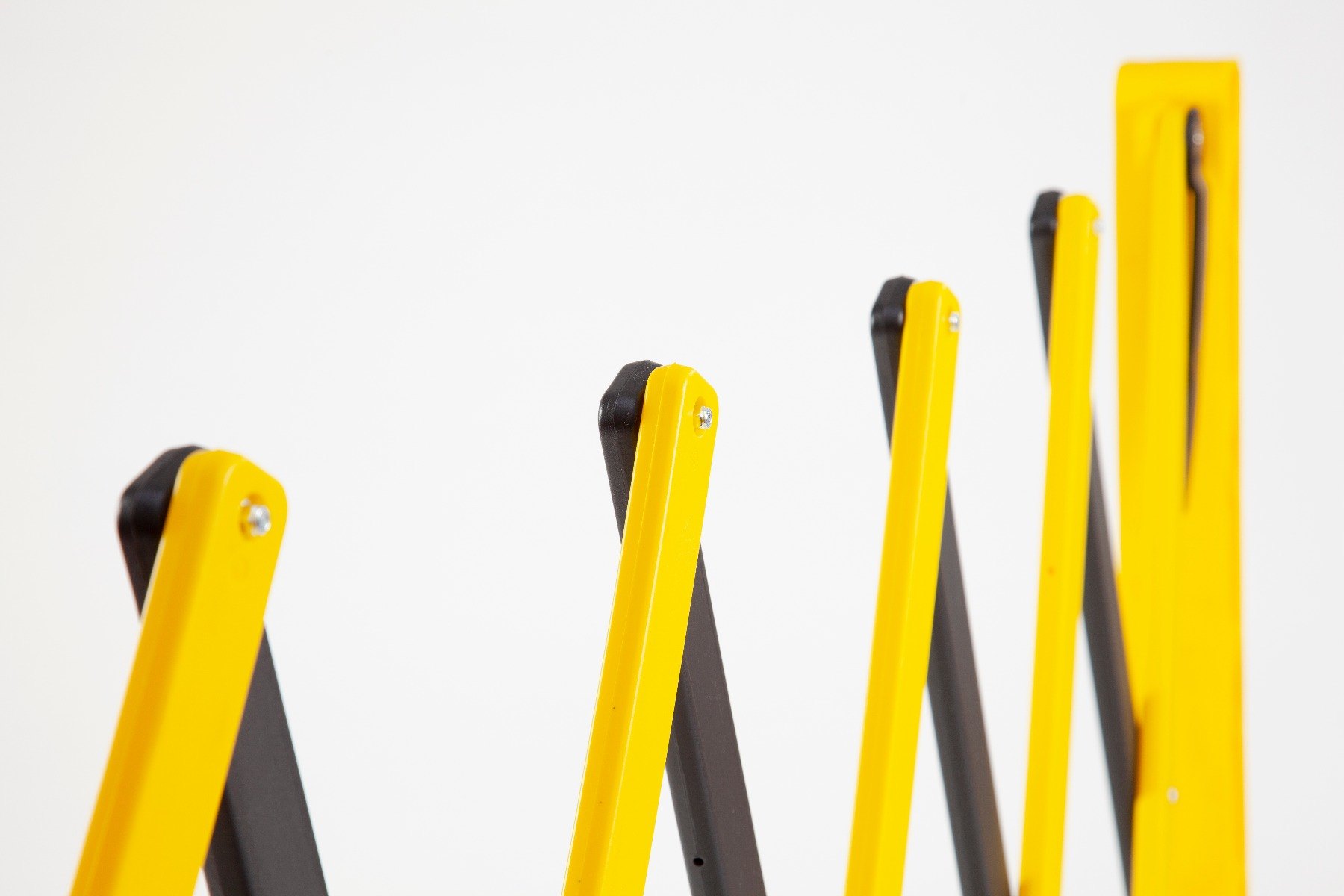 Expandable barrier with wheels for easy handling, manufactured from durable, corrosion-resistant HDPE plastic in a high-vis black and yellow finish.