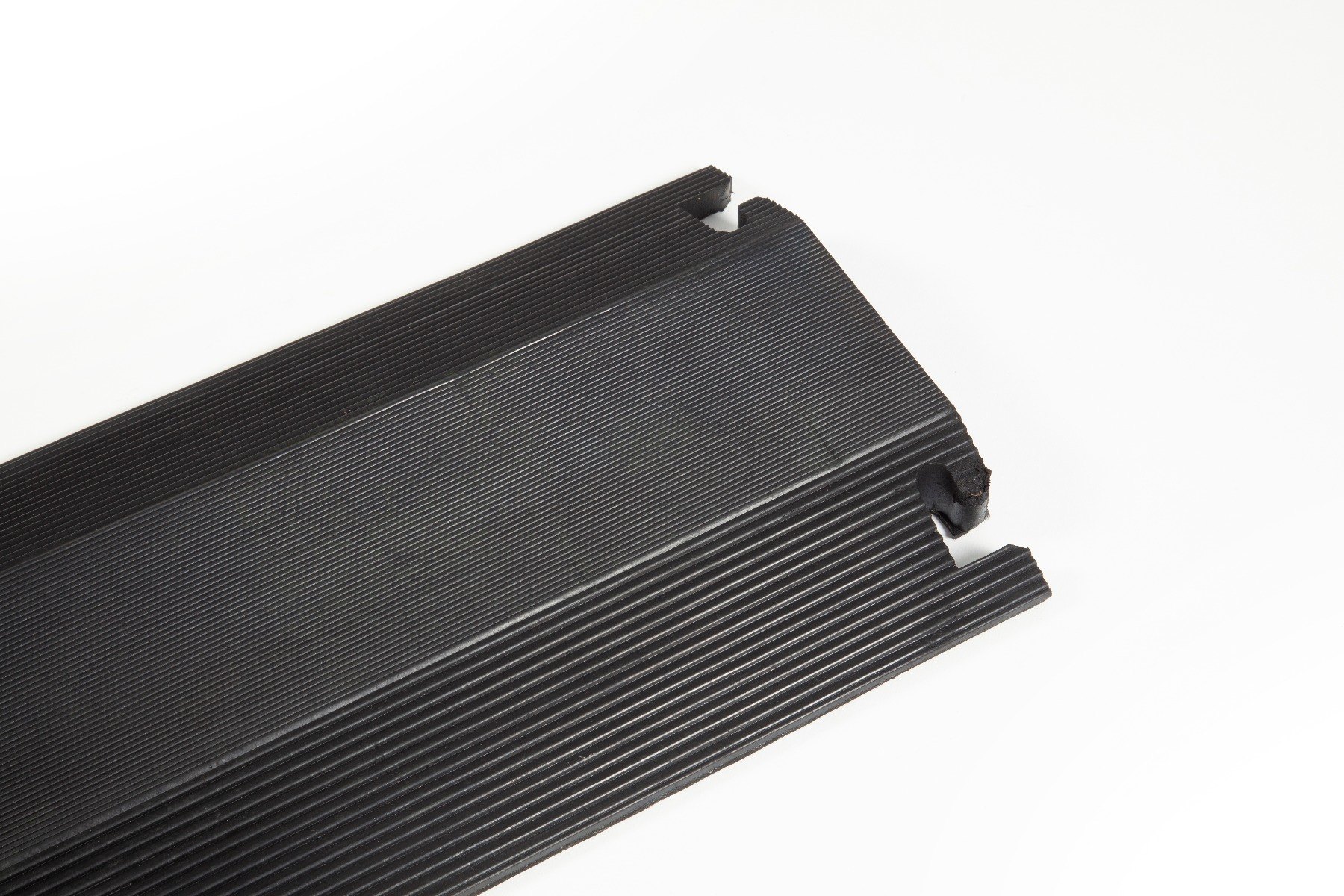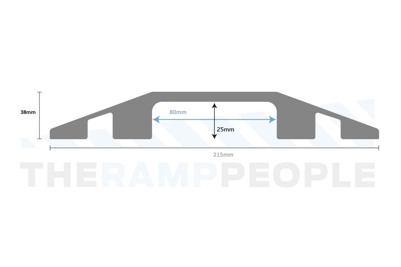 38mm high rubber cable cover with a 80mm x 25mm channel suitable for cables up to 24.5mm in diameter.