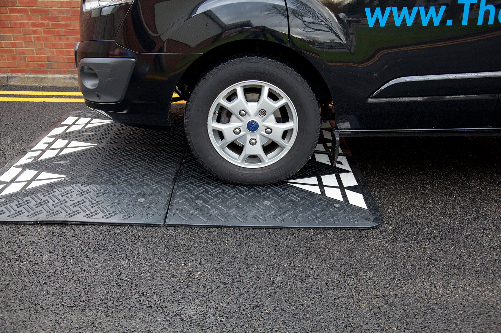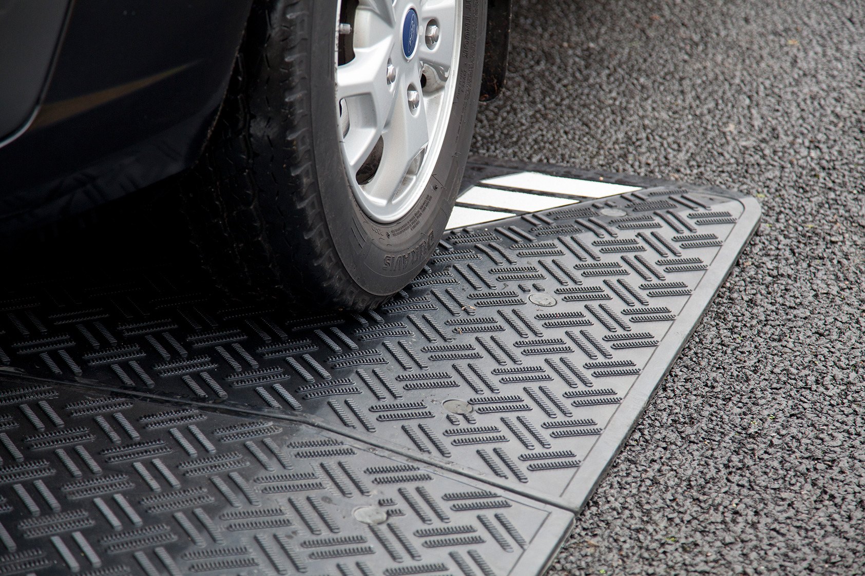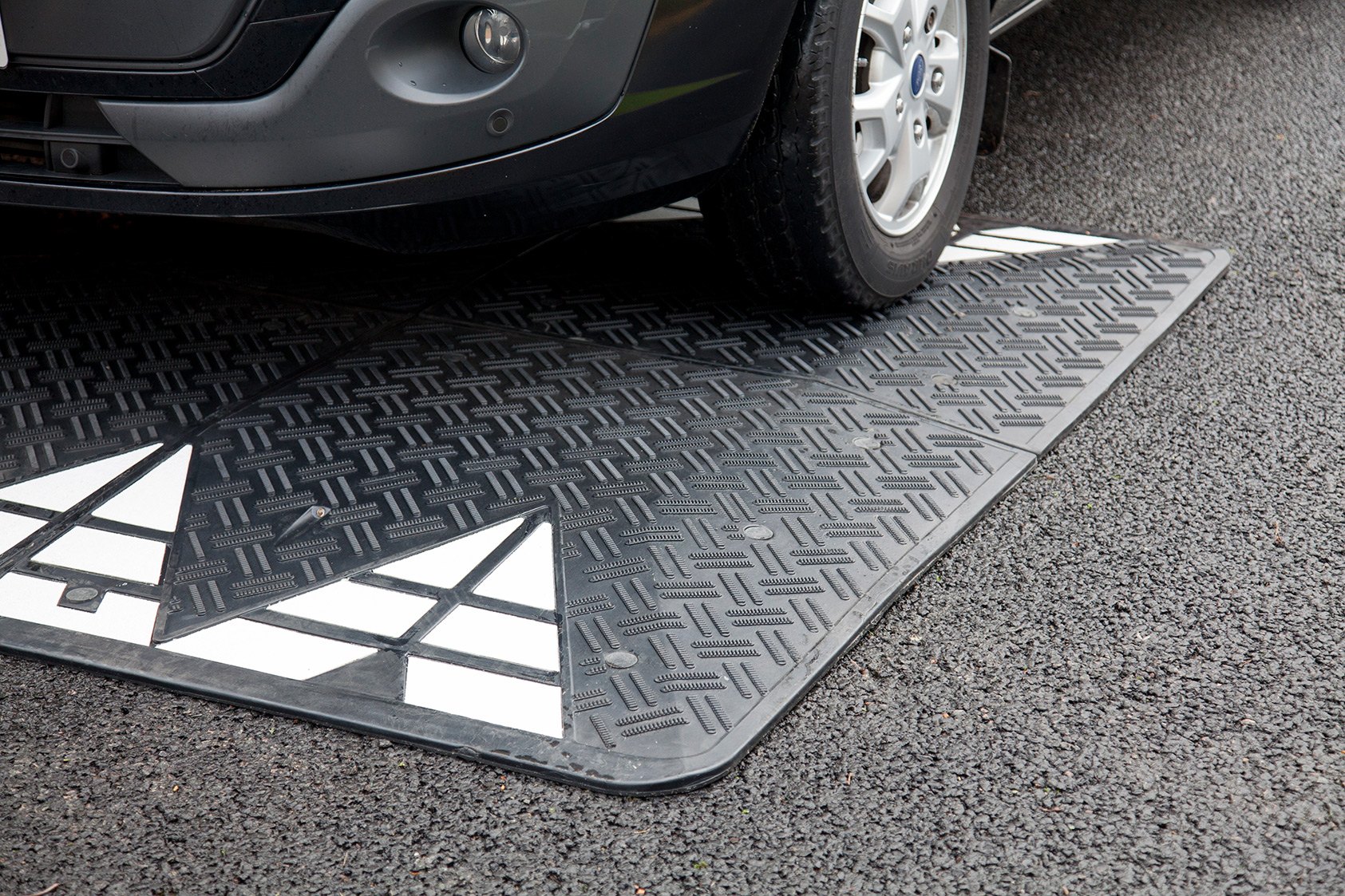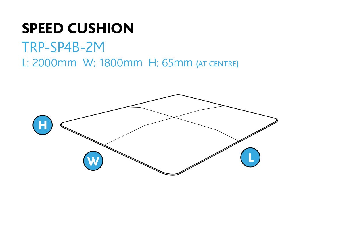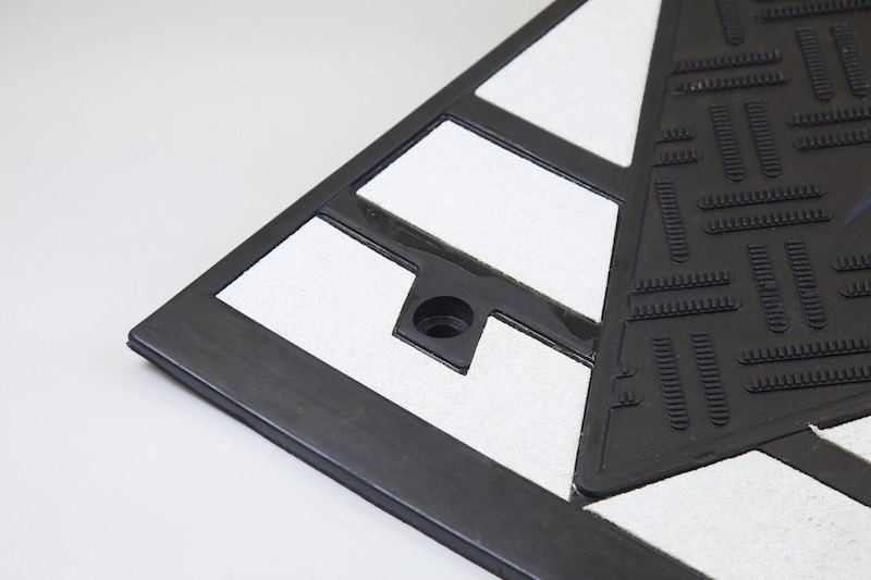 65mm high black rubber speed cushion designed to slow vehicles to speeds of 6mph. Due to the design, the speed cushions allow emergency vehicles to safely pass over the speed cushions with limited impact whilst reducing the speed of vehicle traffic. The speed cushions are provided with fixings for tarmac and concrete.