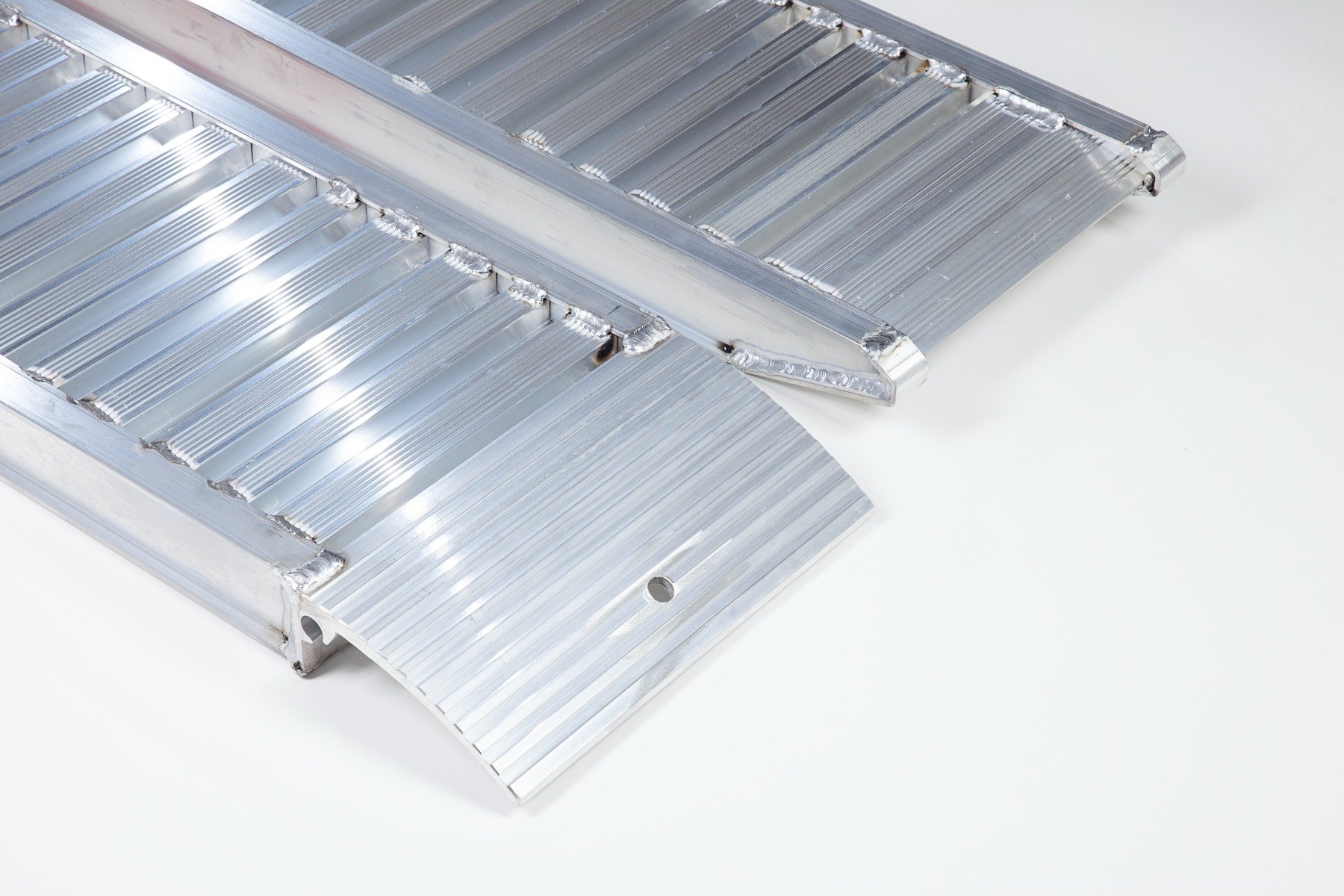 The loading ramps have a curved rest on connection with a pre-drilled hole to allow you to secure the ramps to your vehicle. The base of the ramps is cut at an angle based on the load height to ensure they remain securely on the ground during loading. The ramp angle and weight of the ramps also ensures that the ramps remain in place. Alternative connection options are available.