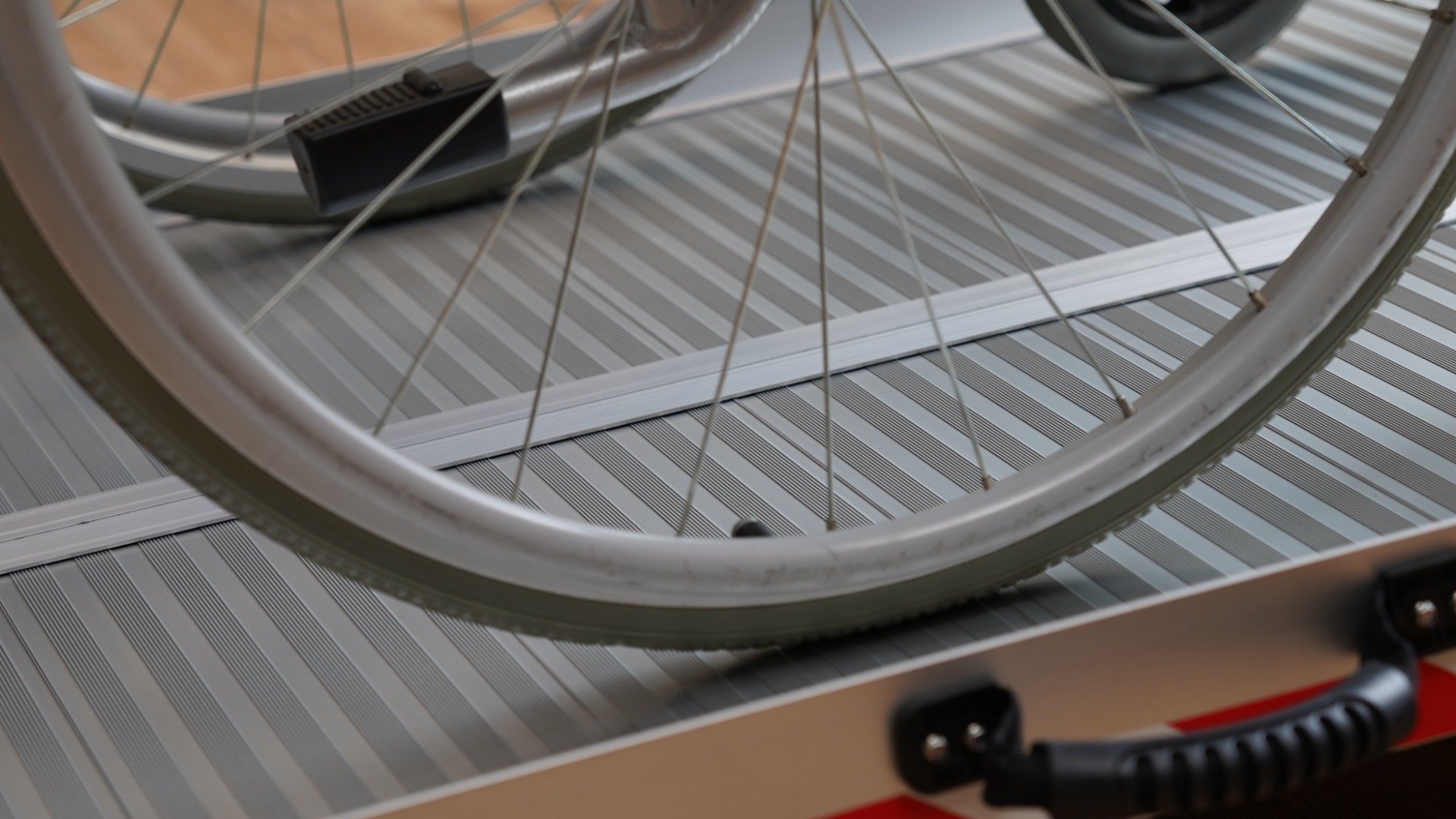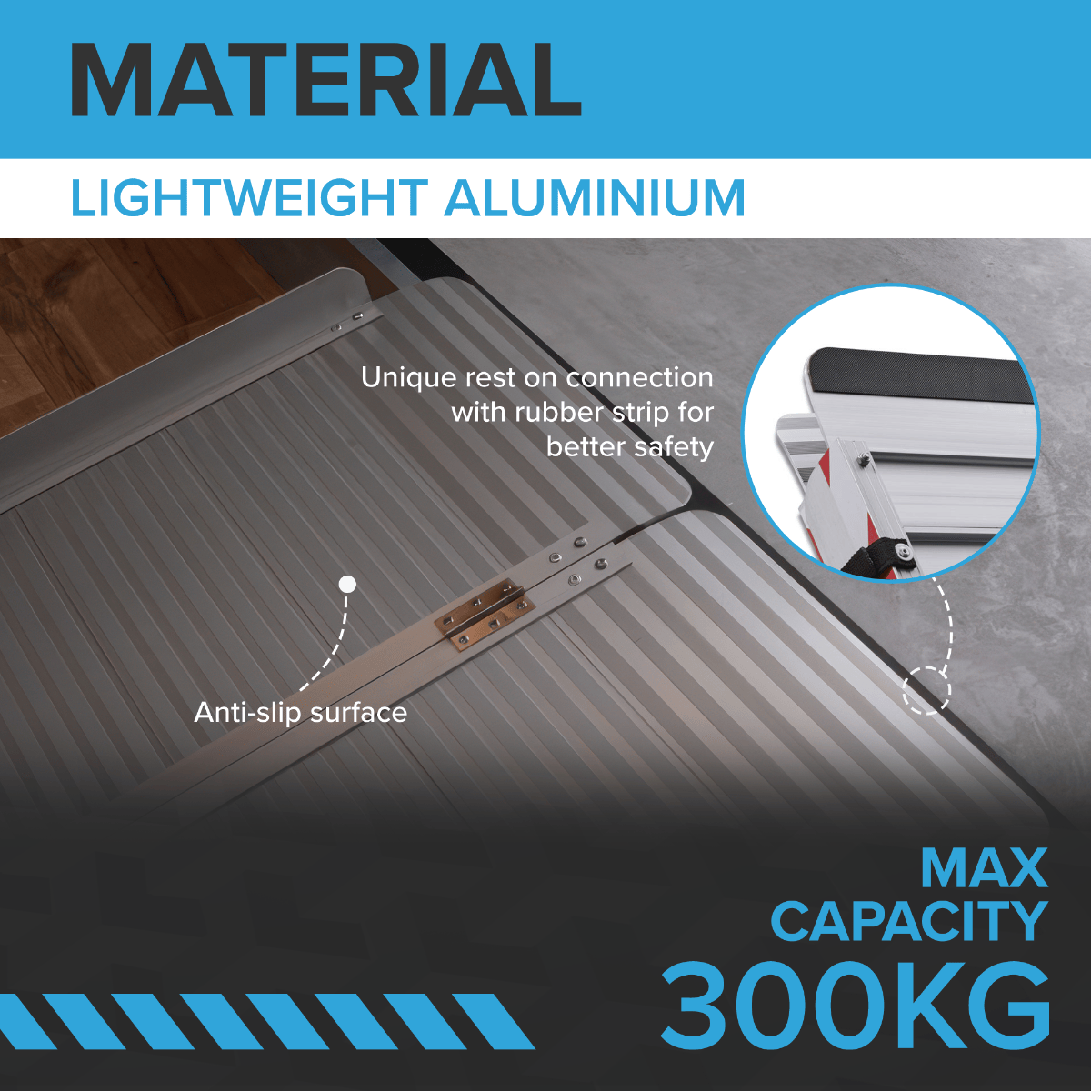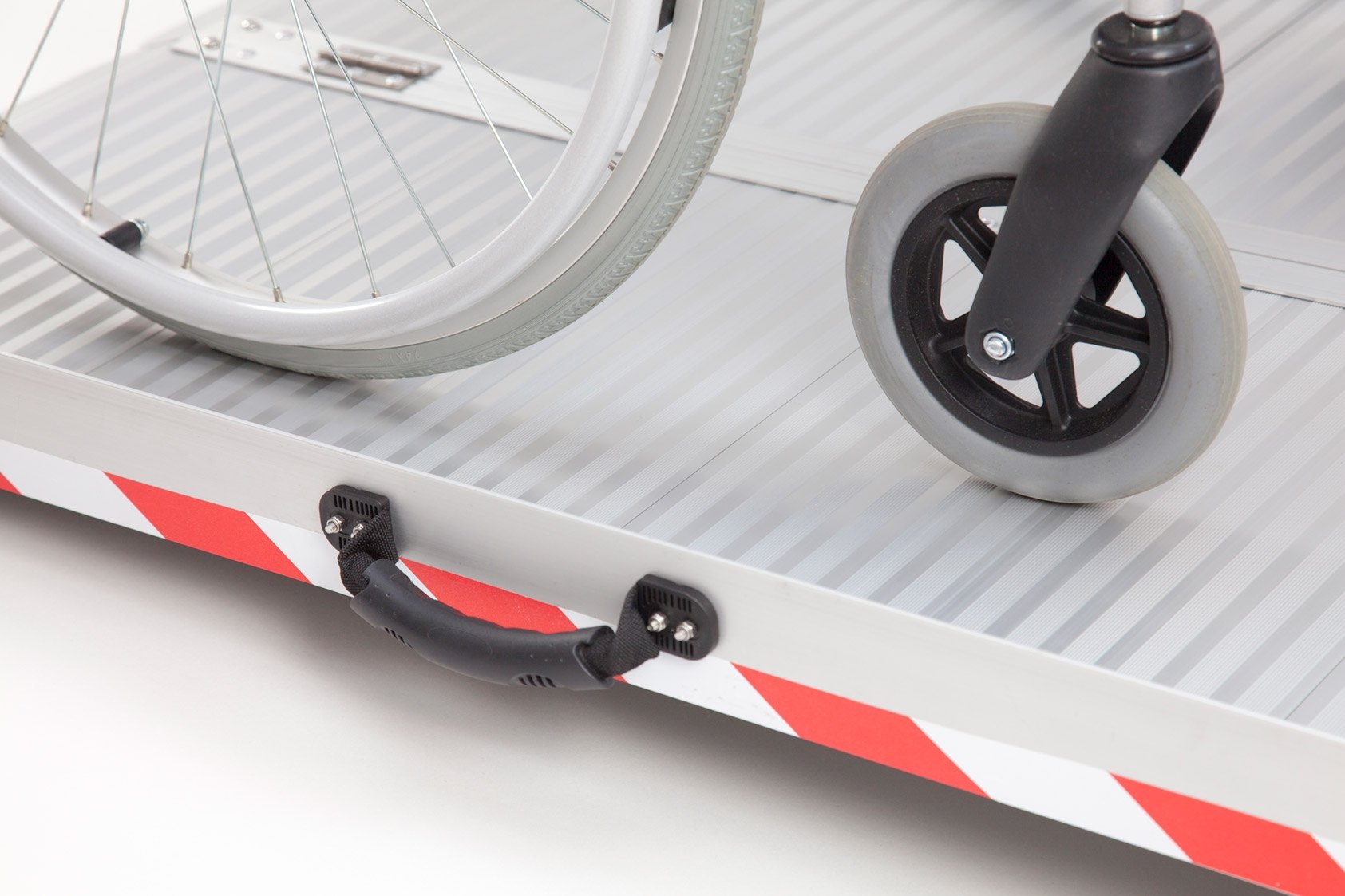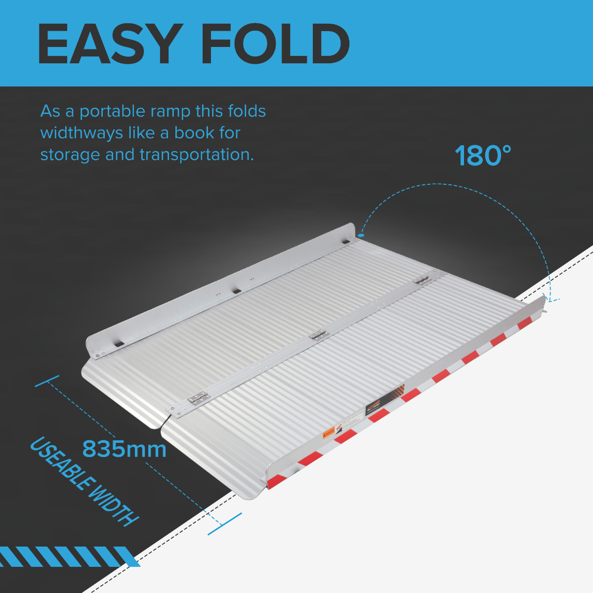 The Ramp Factory's extra wide folding wheelchair ramp is lightweight to provide access over a variety of thresholds. With an internal width of 835mm and a total width of 850mm, this ramp is wider than The Ramp Factory's standard folding ramp. The Extra Wide Folding wheelchair ramp has slip resistant surfaces for added safety and it is suitable for manual wheelchairs, electric wheelchairs, and mobility scooters.